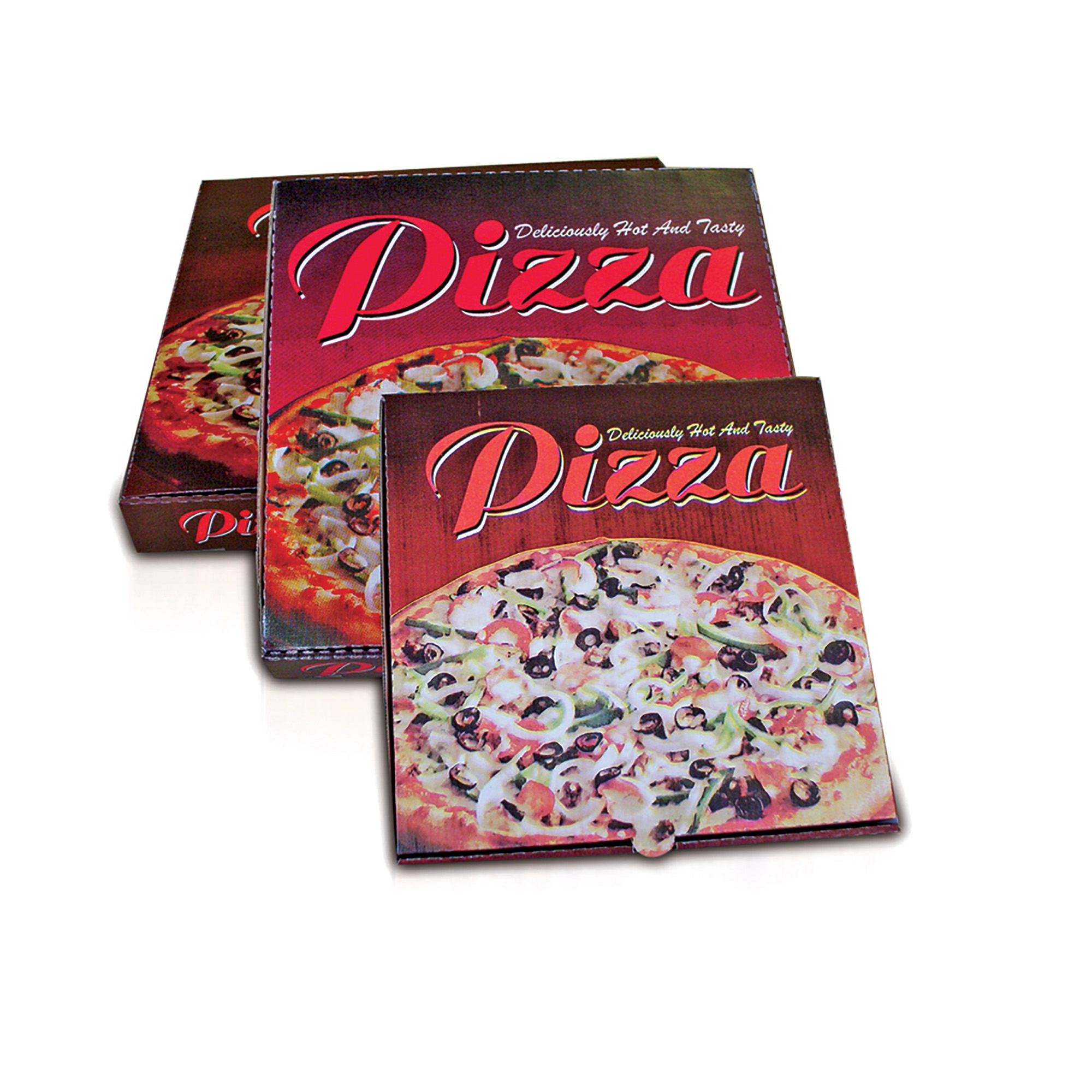 Bring pizza to life and add a new dimension to your packaging with a quality coloured pizza box. The message on the box is ‘deliciously hot and tasty pizza’ and it shows a traditional tasty pizza image on the front. Manufactured from high quality single wall corrugated board with double reinforced sides and an integral hinged lid to provide superior strength and secure for take away pizzas. Our pizza boxes are easy to make up, with single piece construction and a cut away hole at the front, making it easy for your customer to open.